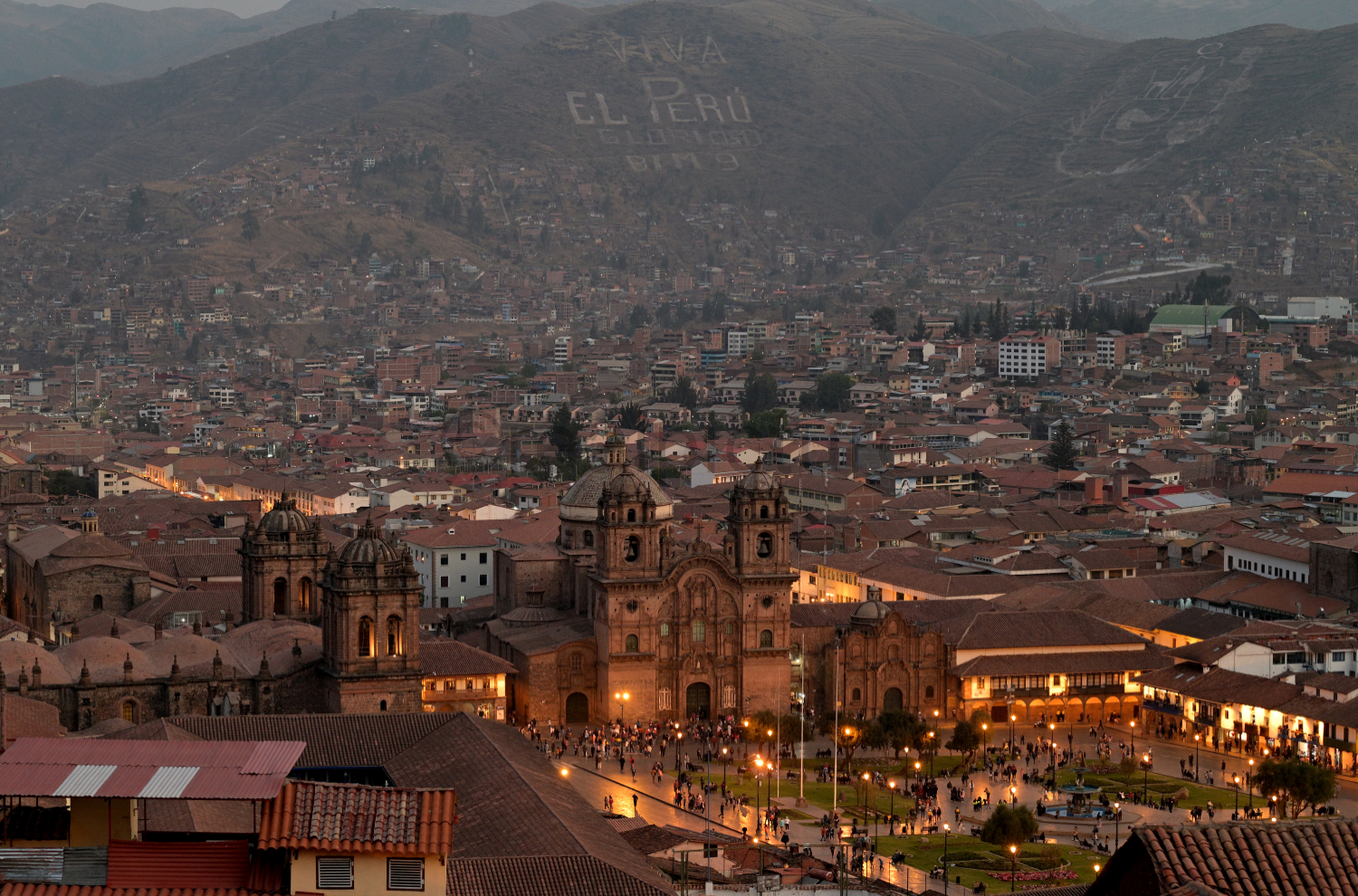 Cusco am Abend (3.416 m ü. NN). Blick vom Templo San Cristobal auf die touristische Innenstadt.